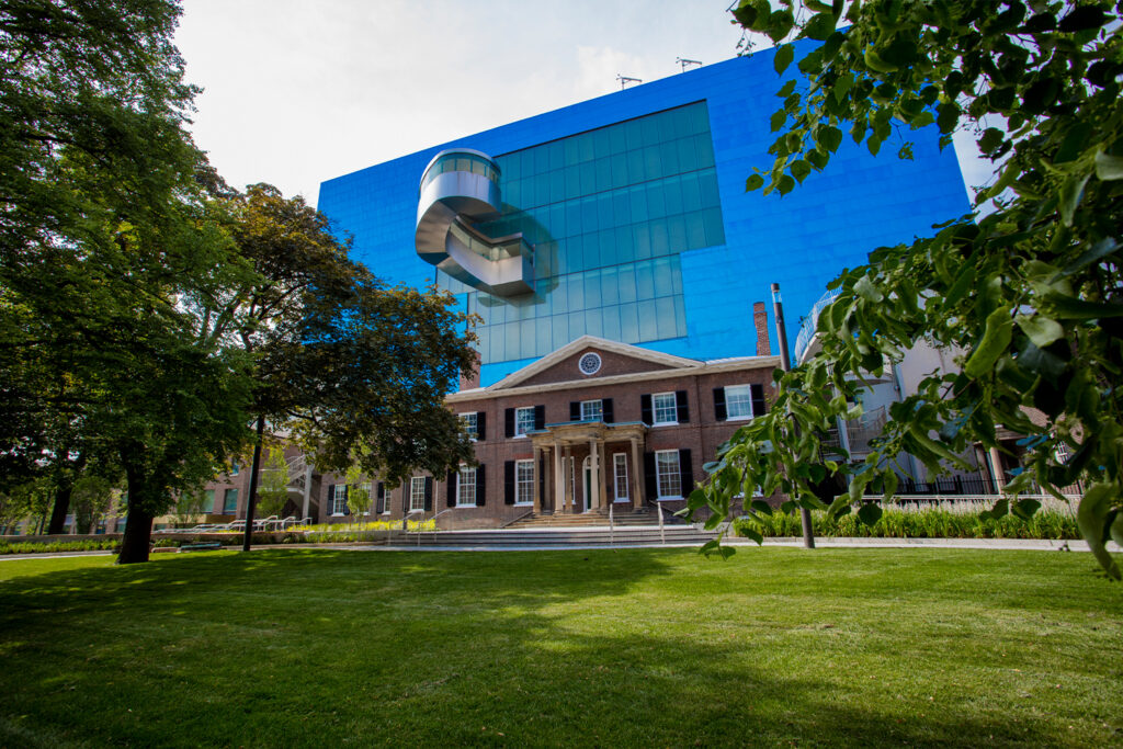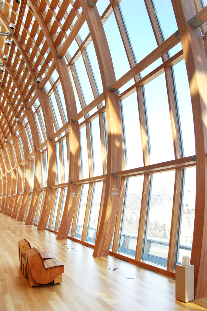There is the Art Gallery of Ontario, which Gehry redesigned in 2008. The Toronto landmark was his first building in his birth country, and it remains as influential and important as the artworks housed inside. Externally, a striking glass facade envelops the building in its embrace; internally, a flagship spiral accessibility ramp made of Douglas fir exudes a quiet confidence. The mix of smooth wood and shiny glass is seen throughout the space, with natural light pouring in from large windows and artfully-placed skylights.