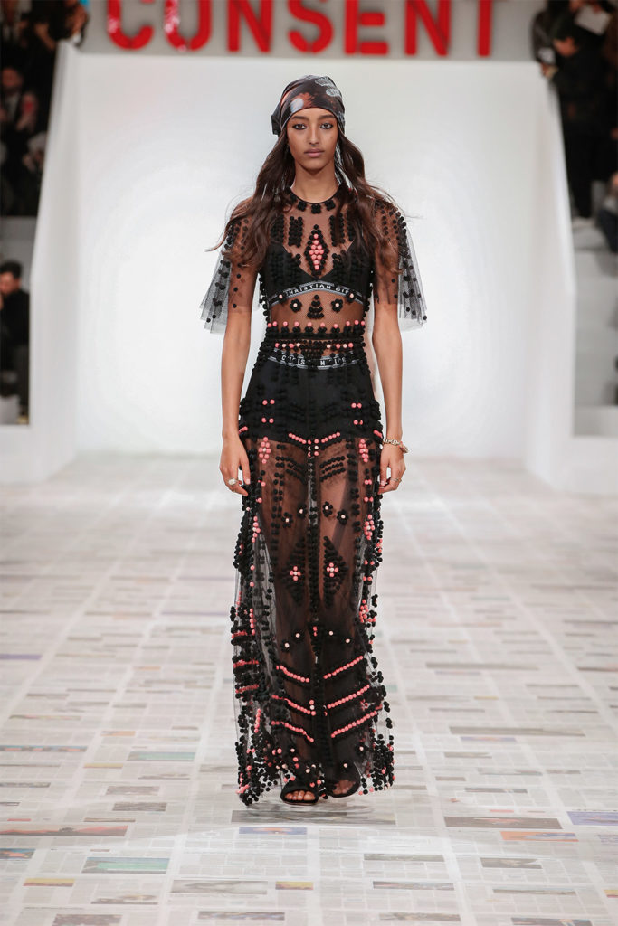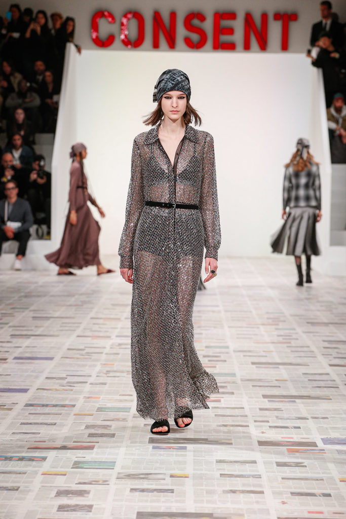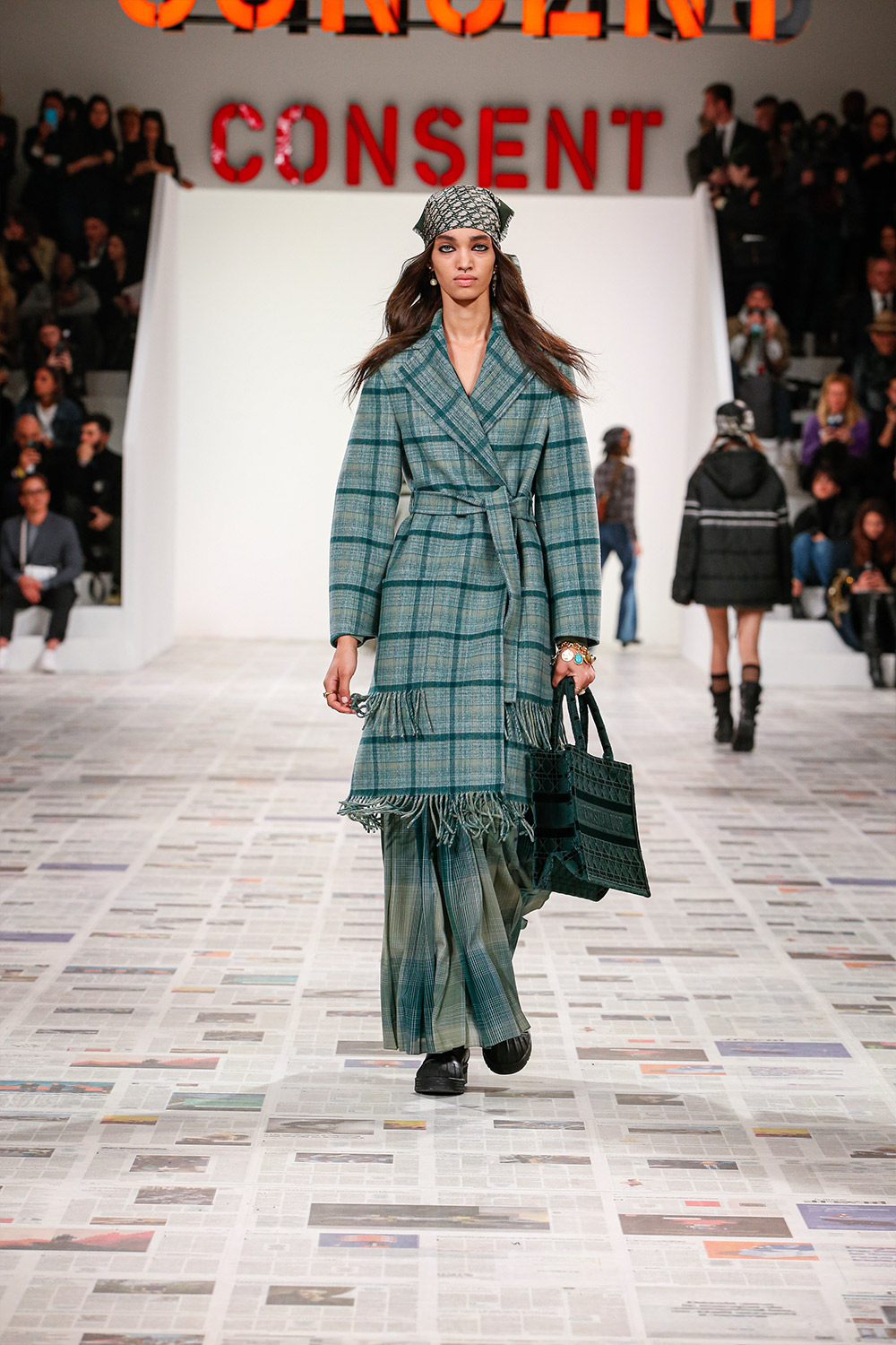 Maria Grazia Chiuri presented the Dior Ready-to-Wear Fall/Winter 2020 runway show in Paris—a collection inspired by her own personal past, described as an “autobiography, self-portrait, story.” These emotions came from her teenage diary and images that brought her back to moments where she was unsure of her future. The words “I say I”, seen at the show’s entrance, show self-assertion and the many approaches of feminine subjectivity. The word “consent” was also seen at the show, as well as other quotes that are all examples of the strong feminine approach Maria Grazia Chiuri brings to her collections as a female designer designing for women. The collection was made up of tailored pieces, mixed prints, and matching sets. The front row was star-studded with strong women including Demi Moore, Sigourney Weaver, and Bianca Jagger, to name a few.