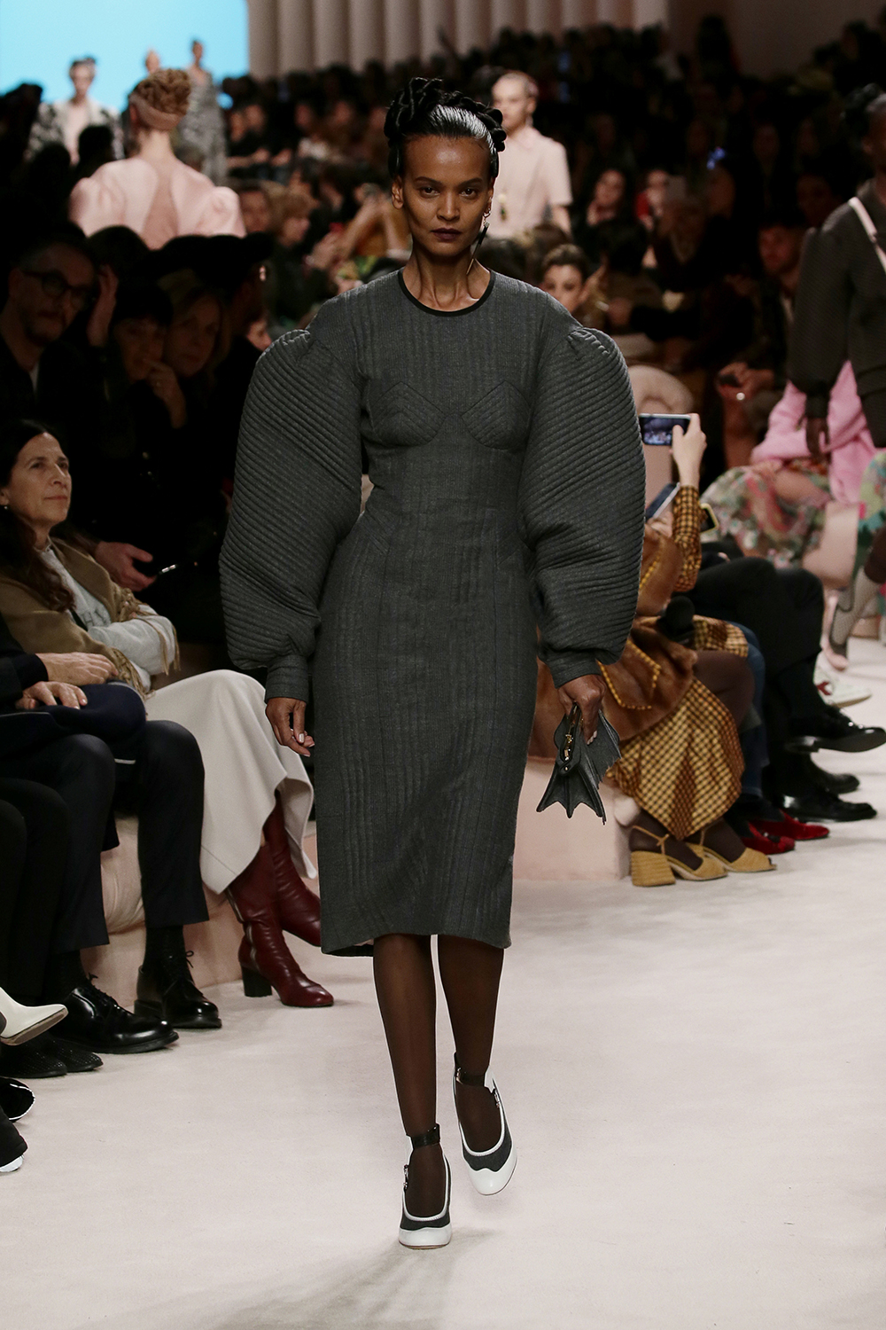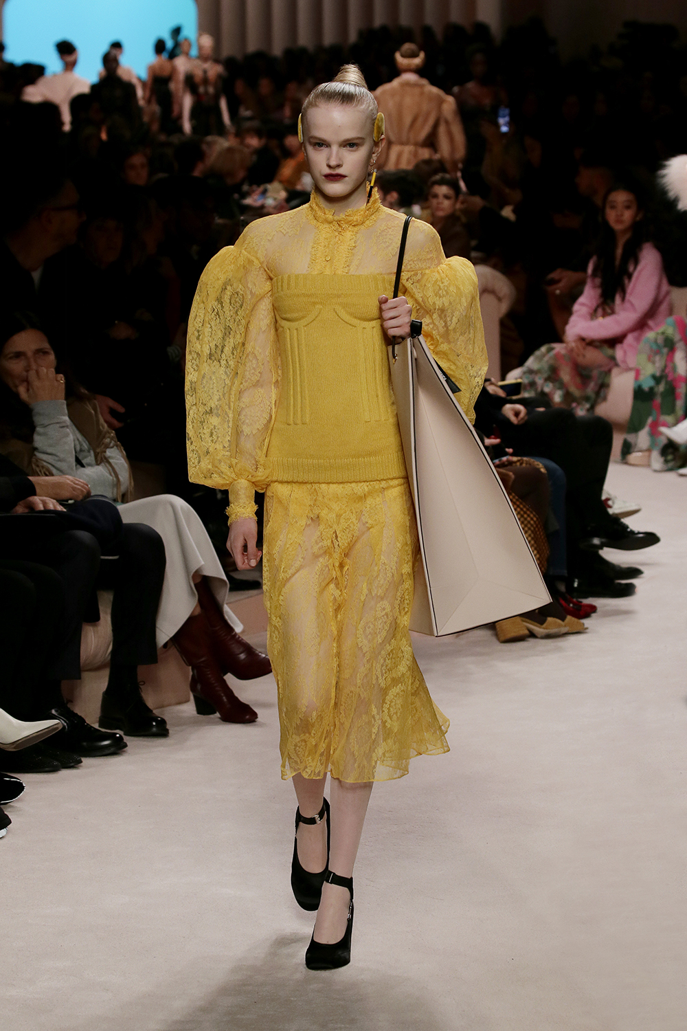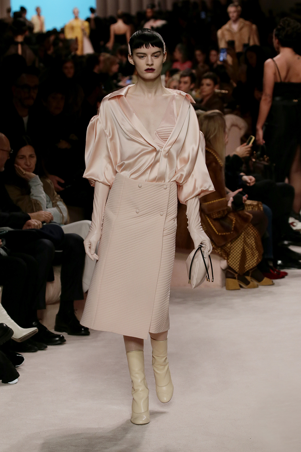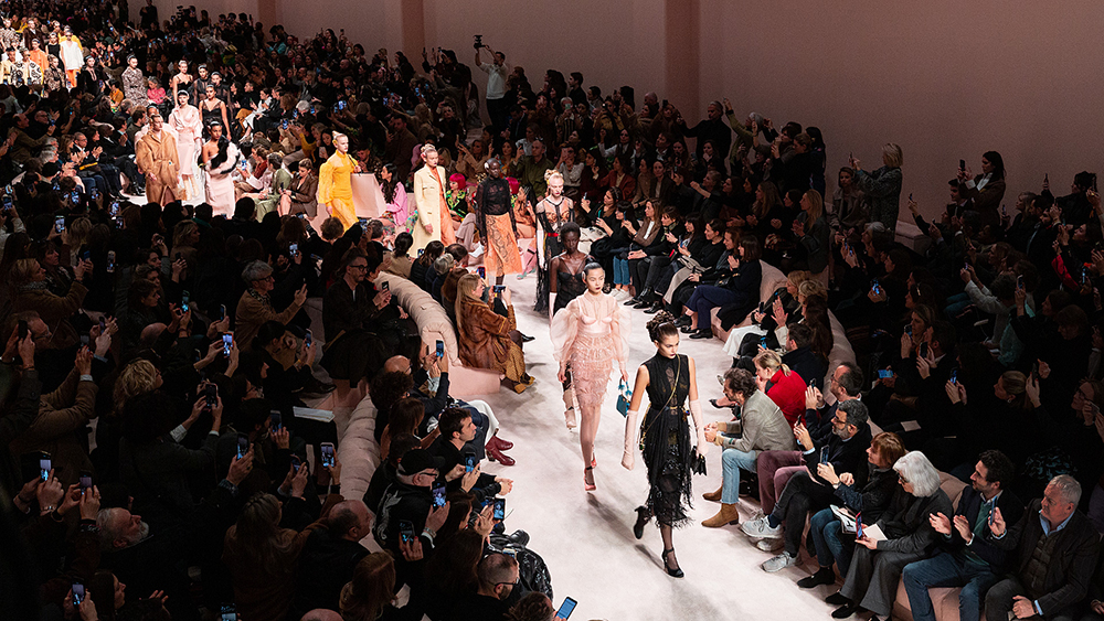 FENDI presented its women’s Fall/Winter 2020 collection in Milan, showcasing monochromatic sets, structured tailoring, and dreamy sleeves. The collection is described as looks ranging from “the boudoir to the boardroom” with sheer dresses to power suits for every woman, featuring two of the first ever size inclusive models to walk for FENDI. Accessories played a big role in the collection with a new Peekaboo bag in three sizes, and a hand knit wool version of the FENDI Iconic Baguette bag.