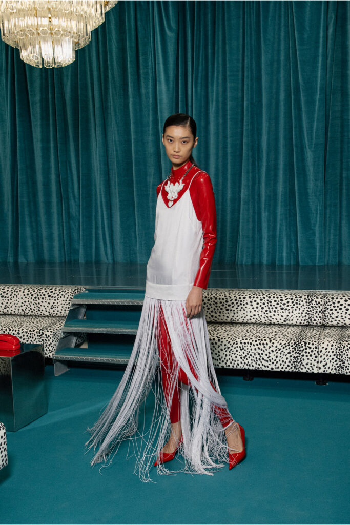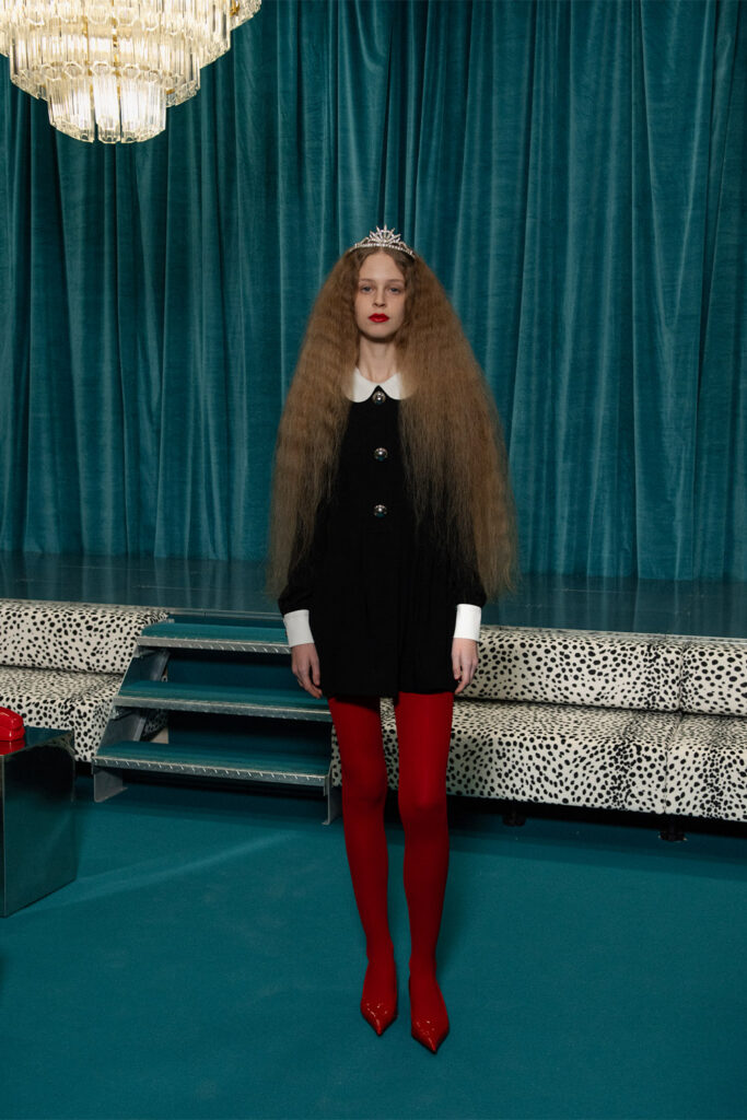 I began day two—the busiest one yet—with a brand I’ve admired from afar for a long time: Italian label Fiorucci. Walking into the presentation at Somerset House felt like stepping into a Scarface-era living room. Models played pool and chatted on cherry-red handline phones while lounging on Dalmatian-printed couches with dramatic headpieces completing the opulence of the setting.