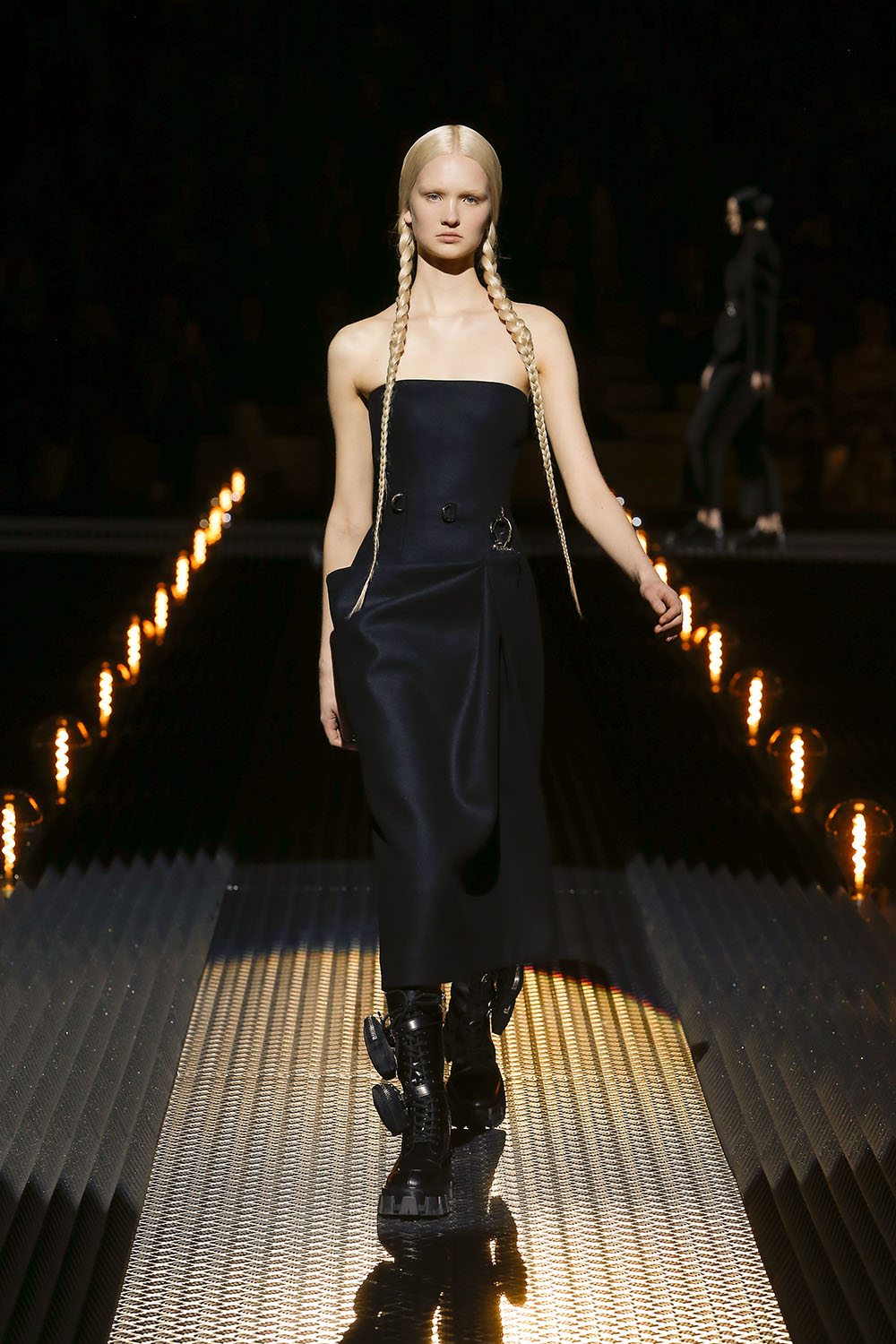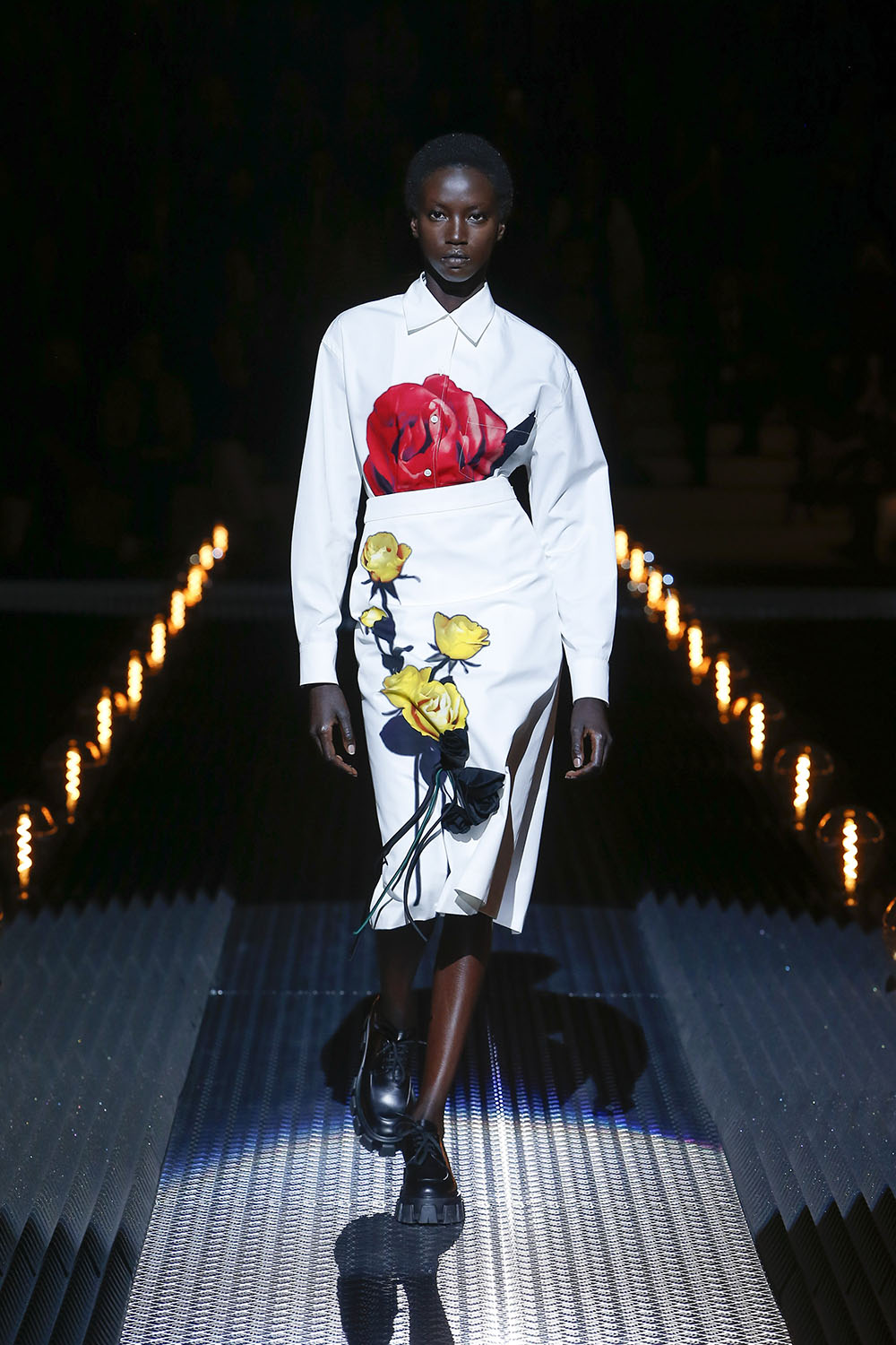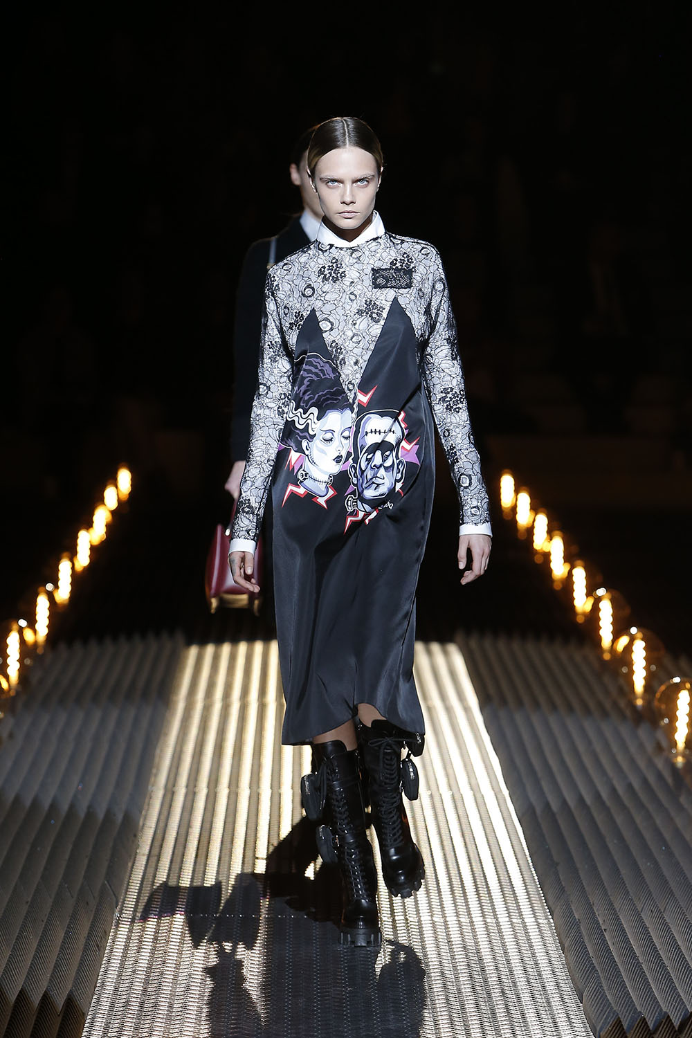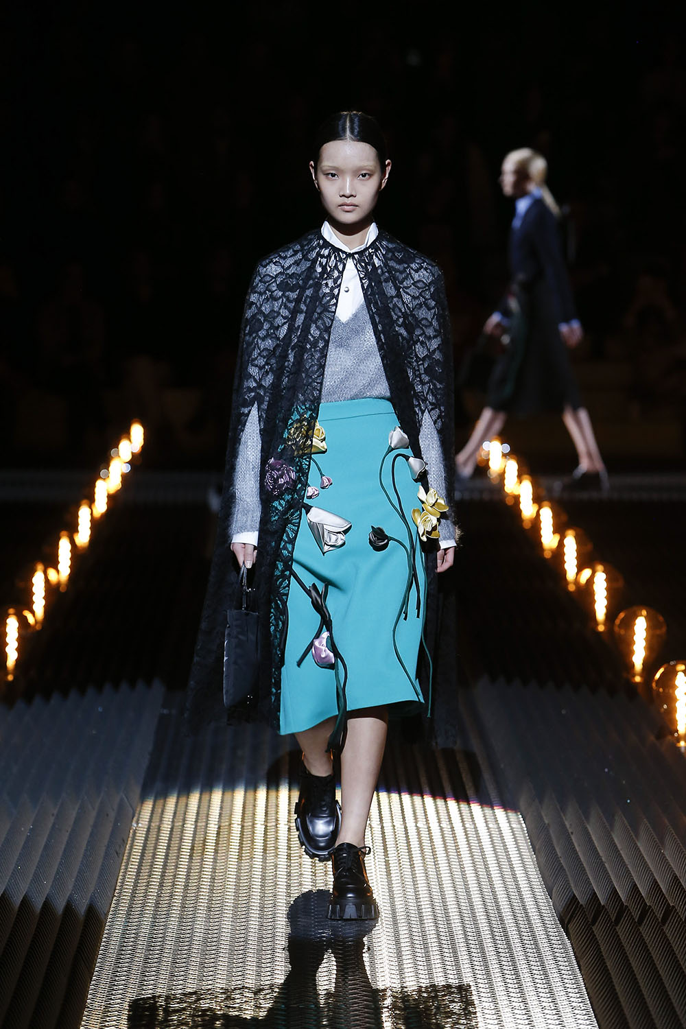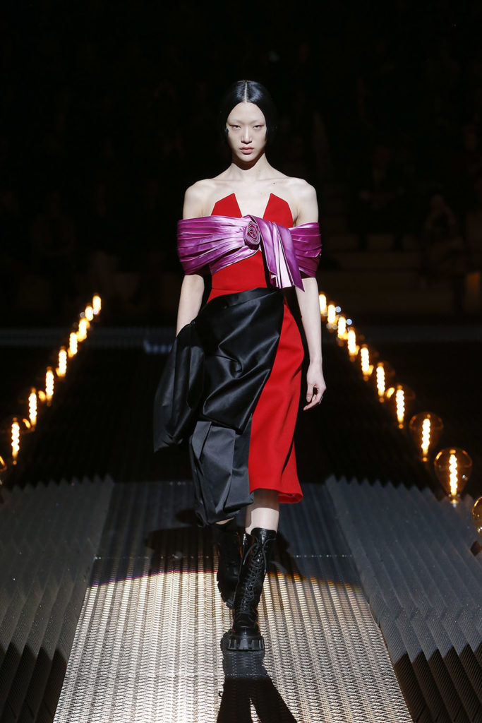The ideology behind the Prada Fall/Winter 2019 Womenswear show is explained as: “Romance. The Romantic. Romance as a literary and artistic pursuit, and romance as a human experience. Both place an emphasis on emotion and individualism, on feeling, a reaction against the rational. A tension, between nature and civilisation.” This can be seen throughout the collection in lace, florals, and dreamy silhouettes, with a hint of dark romance and danger adding a sense of mystery and excitement to the garments, pulling them away from traditional territory and into something new. The uniformity came in the hairdos on the models with each sporting a variation of slicked styles with plenty of shine.