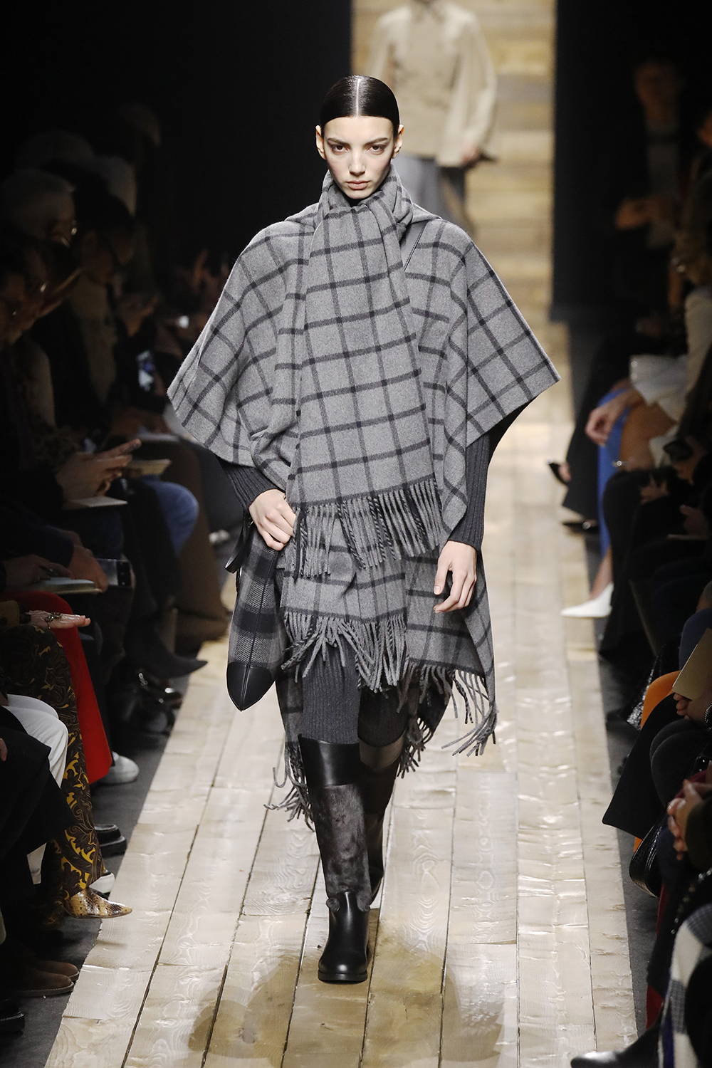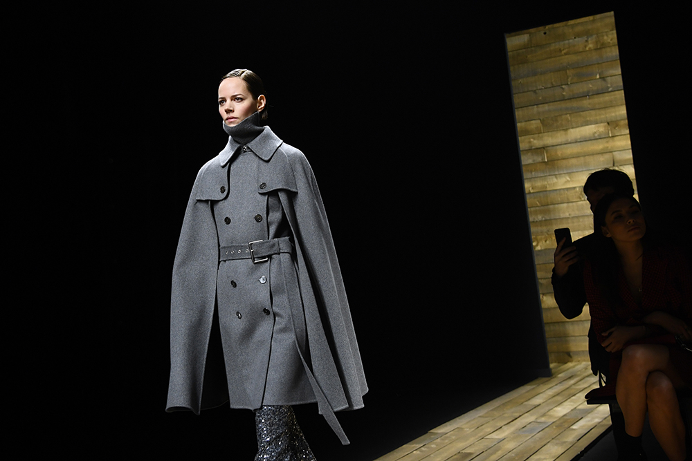 Capes, oversized luxurious knitwear, lean riding pants, and equestrian-inspired footwear and accessories were complimented with appealing fall hues that echoed the natural theme. Within the collection, classic MKC travel bags took on many new forms with considerate attention to detail, from buttery-soft leather to cowhide prints and shearling trimmings. “This collection explores that idea of getting away from it all, of taking some time to escape into nature and refuel. And of course, since we can’t all move to the countryside, we looked at how you can take that feeling of privacy and coziness and imbue it with the polish and luxury you need in an urban environment,” shares Michael Kors.