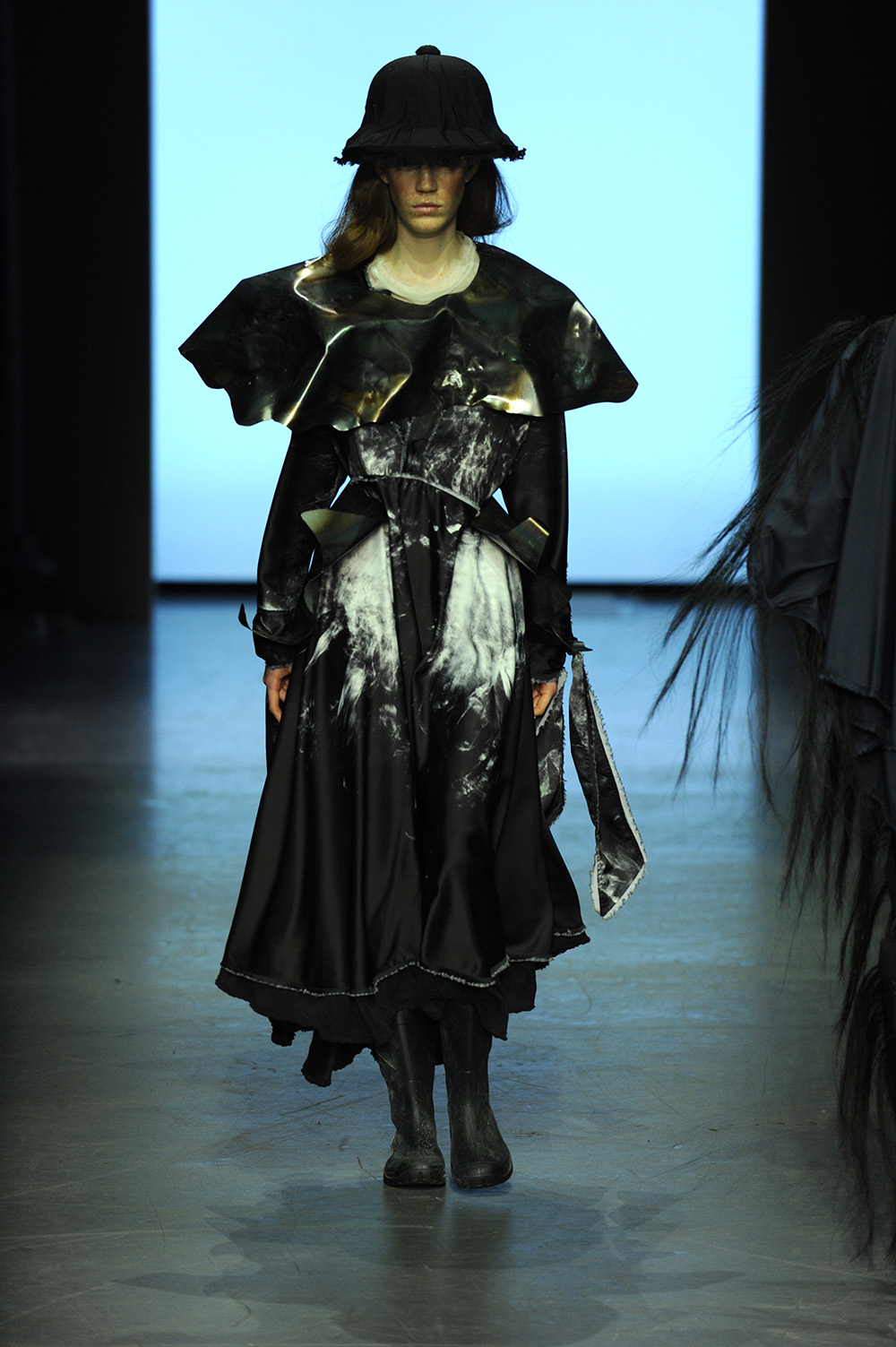 Stephanie Moscall-Varery, the designer behind MOSKAL and a student at London College of Fashion, presented her MA collection “Pit Brow, A Spatial Ghost.” The collection is inspired by the women that worked in the British mining industry in the 1900s. Stephanie worked in partnership with the National Coal Mining Museum for England to pay homage to the historic subject, and look towards the future of innovation. Throughout the collection is flexible charcoal composite made of active charcoal and natural binders, a direct influence from her inspiration.