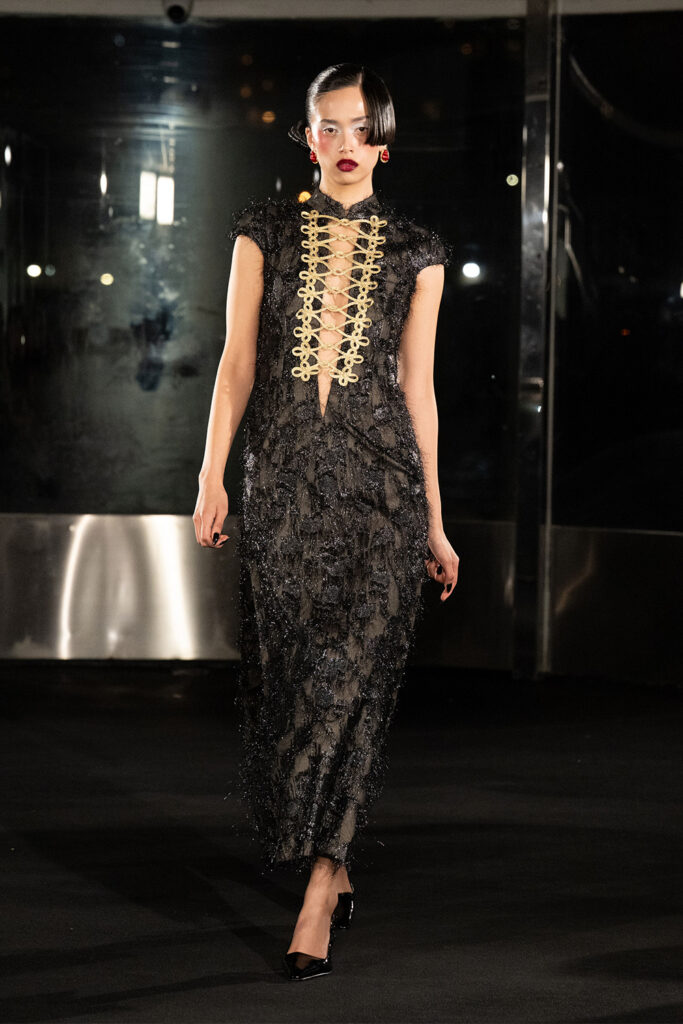 The Kim Shui show took place aboard a cruising yacht on the East River, with pieces exploring themes of discovery, migration, and cultural exchange—some inspired by traditional Chinese knotting techniques. Looks were paired with their official footwear partner, Dolce Vita, to complement the wearable aesthetic.