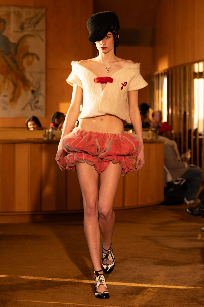 Sprinkled across the runway were brand-signature bug-eye sunglasses, puffed sleeves, ruffled collars, lots of lace, silk and satin, and pieces made from deadstock fabric. The bags were designed by the South Korean brand Stand Oil, and standout pieces were on display as models walked the runway, holding Kombucha in hand.