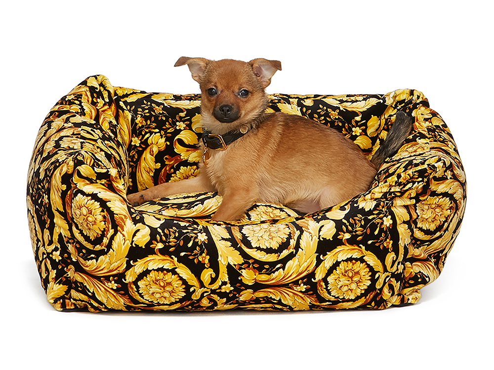 Products mentioned: Barocco Dog Bed, Versace, $1825; Didi Collar, Ashely Williams for SSENSE, $135; Poldo Dog Couture Edition, Moncler Genius, $440; Cat Bowl, Tiffany & Co, $135; Pet Leash, Tiffany & Co, $470; Dog Carrier, Louis Vuitton, $3,650; Animal Shampoo, Aesop, $51; Woof Clicquot Toy, Haute Diggity Dog, $17; Merry Beaded Dog Collar, Susan Alexandra for Nordstrom, $90; Rainbow Pom Knit Dog Sweater, LoveThyBeast, $70; Dog Cardigan, Ware of Dog, $95; Dog Harness, Wild Ones, $30; Print Pet Bed, Huts and Bay, $107; The Dog Room, Made by Pen, $483; Cuddly-Coat Cleansing Spritz, Kiehl’s, $21; Jason Espresso Dog Bed, Lord Lou, $231; Copycat Cat Scratcher, Lord Lou $215; Edward Blue Velvet Pet Palace, Lord Lou, $340; Concrete Pet Bowl, Heart + Paw, $56; Catnip Mouser Set, Smalls, $20; Great Shakes, Smalls, $5.